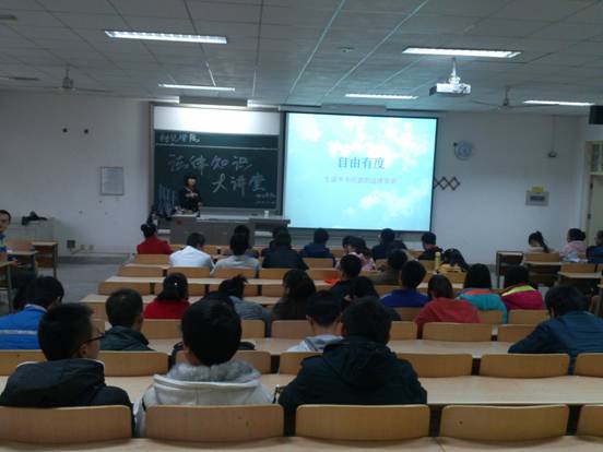 张老师一开始就用两个生活中鲜明并具有代表性的案例引出了此次讲座的主题——自由有度。自由是相对的,没有绝对的自由。张老师以一种独特的视觉为同学们贯彻说明了一种自由但必须有度的思想,并向同学们普及了日常生活中必须了解的法律知识。通过对高层乱扔垃圾、车主借车等案例的解析让同学们更加的明白了自己的权利和义务,在以后的日常生活中,同学们会更加注重自己的个人行为。