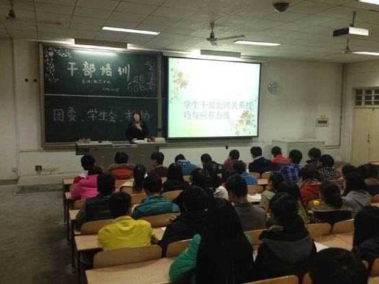 在教1-201对大一各班班长及团支部书记,团委、科协、学生会全体干事等学生干部进行培训,由材化院党委书记张忠主讲“学生干部如何处理好学习生活中的六大关系”。