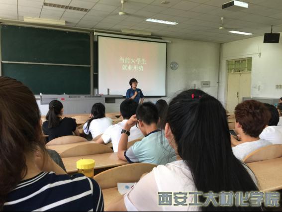 2013级辅导员刘强珺在教1-101,为13级全体学生召开“提前准备 积极应对”就业形势分析大会。