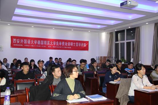 坚增运院长之邀,西安外国语大学德国留学项目负责人孙晓龙一行3人在工3-404召开德国出国留学项目宣讲会,前来参加宣讲的还有西外德国项目常浩和马倩两位老师,小黄书