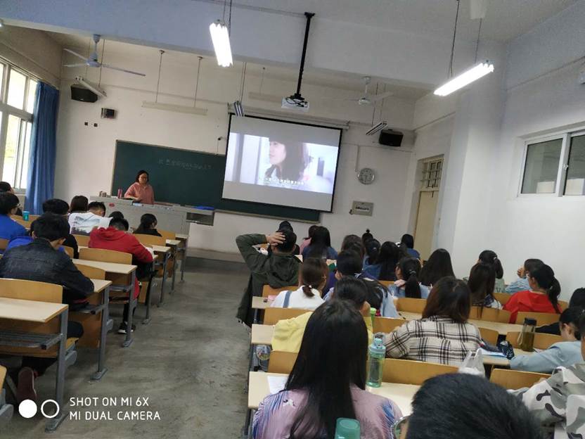 2019年4月23日在教三214教室举办观看《释心》心理微电影活动,心育员王亚茹老师及18级高分子材料与工程专业学生参会。