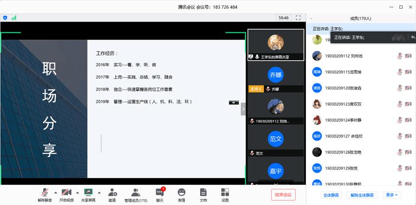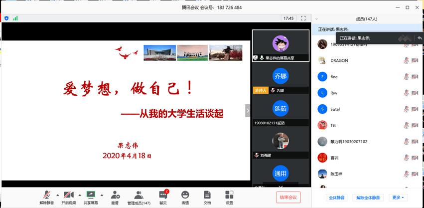 党委副书记张艳霞、副院长陈卫星、郭永春,各年级学生辅导员及180余名学生代表参加了此次云报告会。本次校友云报告会由2009级校友果志伟、2012级校友王学东、2013级校友郝运和2014级校友姚智豪主讲,2019级学生辅导员乔娜主持。