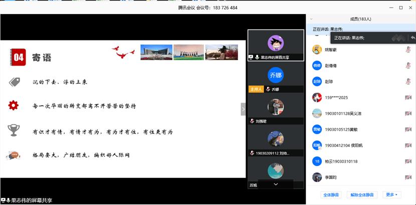 师生代表180余人齐聚云端,共叙情谊。优秀校友果志伟、王学东、郝运和姚智豪不仅向母院汇报了自己毕业后的发展成绩,同时也为材化学子们分享了自己的大学故事和成长感悟。此次优秀校友云报告会为材化学子和校友搭建了一个交流对话的平台,不仅加深了材化学子对专业发展的了解,也让材化学子们感受到了榜样的力量。