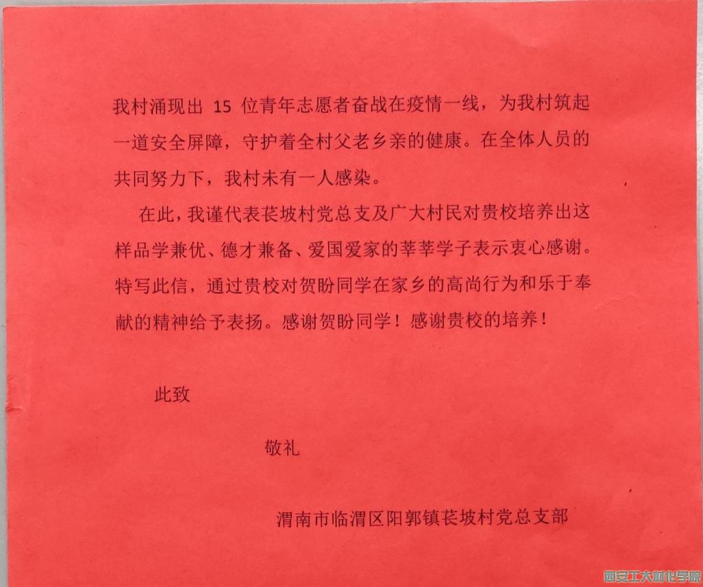 2018级材料化学专业贺盼同学在疫情期间,为当地疫情防控工作贡献青春力量提出了感谢和表扬,并对小黄书