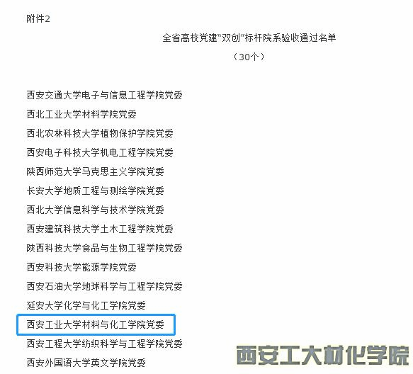 2018年12月,陕西省委教育工委印发《中共陕西省委教育工委关于公布首批陕西高校党建工作示范高校、标杆院系、样板支部培育创建名单的通知》,确定5所高校、30个标杆院系、50个样板支部作为陕西高校党建工作示范高校、标杆院系、样板支部培育创建单位。按照陕西省委教育工委文件明确的验收工作办法,经创建单位对标自查总结、专家组实地考察验收、陕西省委教育工委审查,拟认定5个高校党委、30个院系党组织、50个党支部通过创建验收。