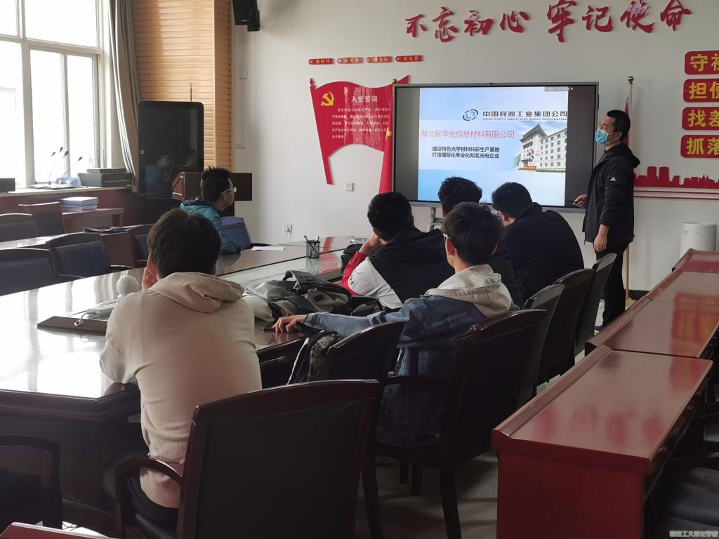 邀请新华光信息材料有限公司人事部程经理为小黄书大四求职学生召开专场招聘会。来自小黄书20余名本科生参加宣讲会。新华光集团副人事部程经理、2017级辅导员段强出席招聘会。