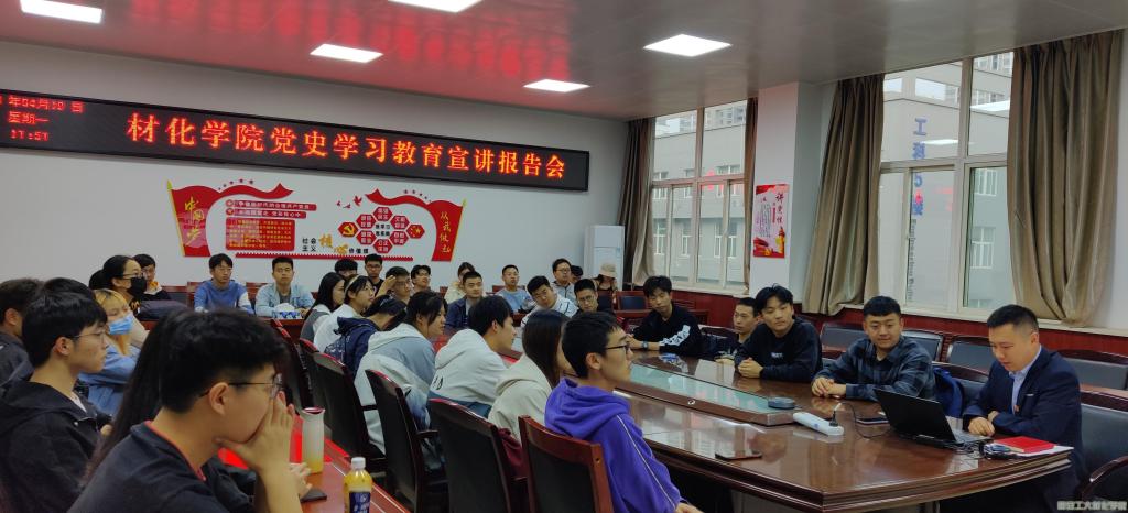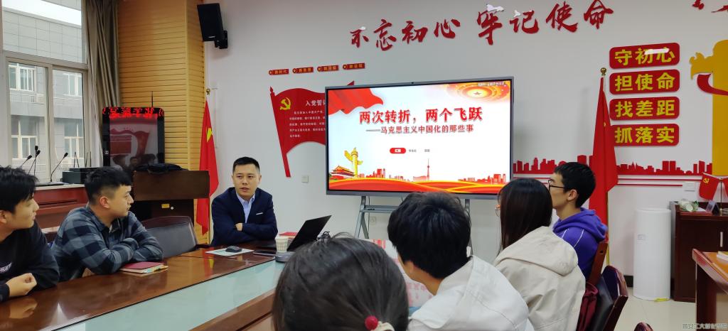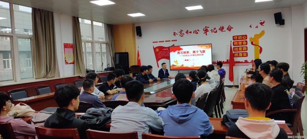 于工3-410会议室举办了以“两次转折,两个飞跃”为主题的党史学习教育宣讲报告会。报告会由学生处学工干部韩霄主讲,2019级学生代表参加。