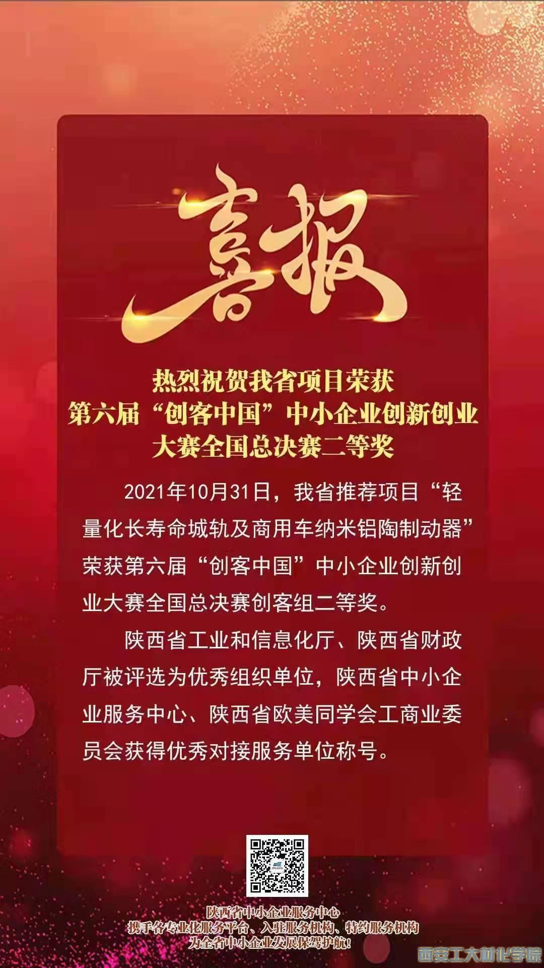 吕煜坤副教授团队的“轻量化长寿命城轨及商用车纳米铝陶制动器项目”成为陕西省入围全国大赛50强的唯一参赛项目,最终获得第六届“创客中国”中小企业创新创业大赛全国总决赛二等奖的优异成绩。