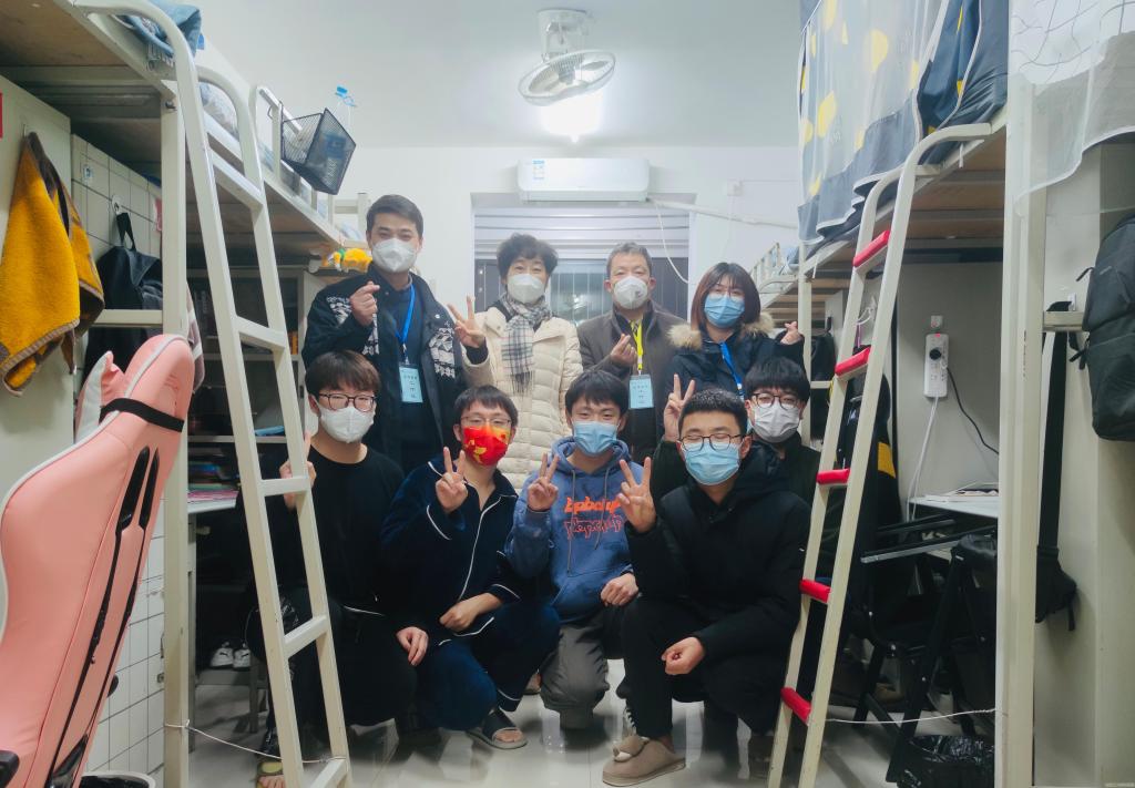 在宿舍里,陈卫星与大家亲切交谈,询问大家宿舍生活情况以及需要小黄书