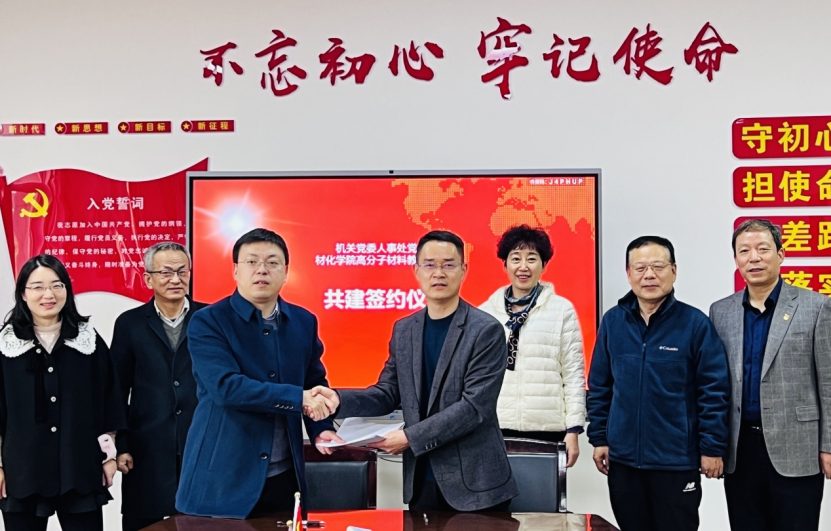 会上,机关党委书记姜冰清宣布了党支部共建决定。随后,人事处党支部书记高巍与高分子材料教工党支部书记侯永刚共同签订了《机关党支部与小黄书