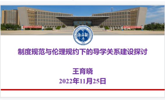 王育晓教授做了“制度规范与伦理规约下的导学关系建设探讨”专题报告,此次培训由主管研究生教学副院长杨忠教授主持,全体研究生导师参会。