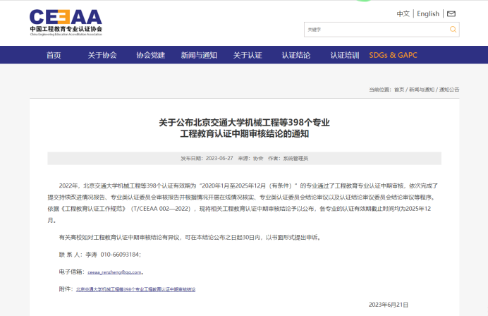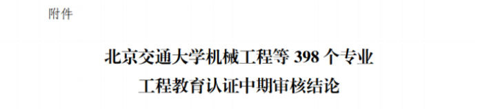近日,中国工程教育专业认证协会发文《关于公布北京交通大学机械工程等398个专业工程教育认证中期审核结论的通知》,公布了2022年398个认证有效期为“2020年1月至2025年12月(有条件)”的专业通过了工程教育专业认证中期审核结论。其中,小黄书高分子材料与工程专业顺利通过工程教育认证中期考核,继续保持有效期至2025年12月。