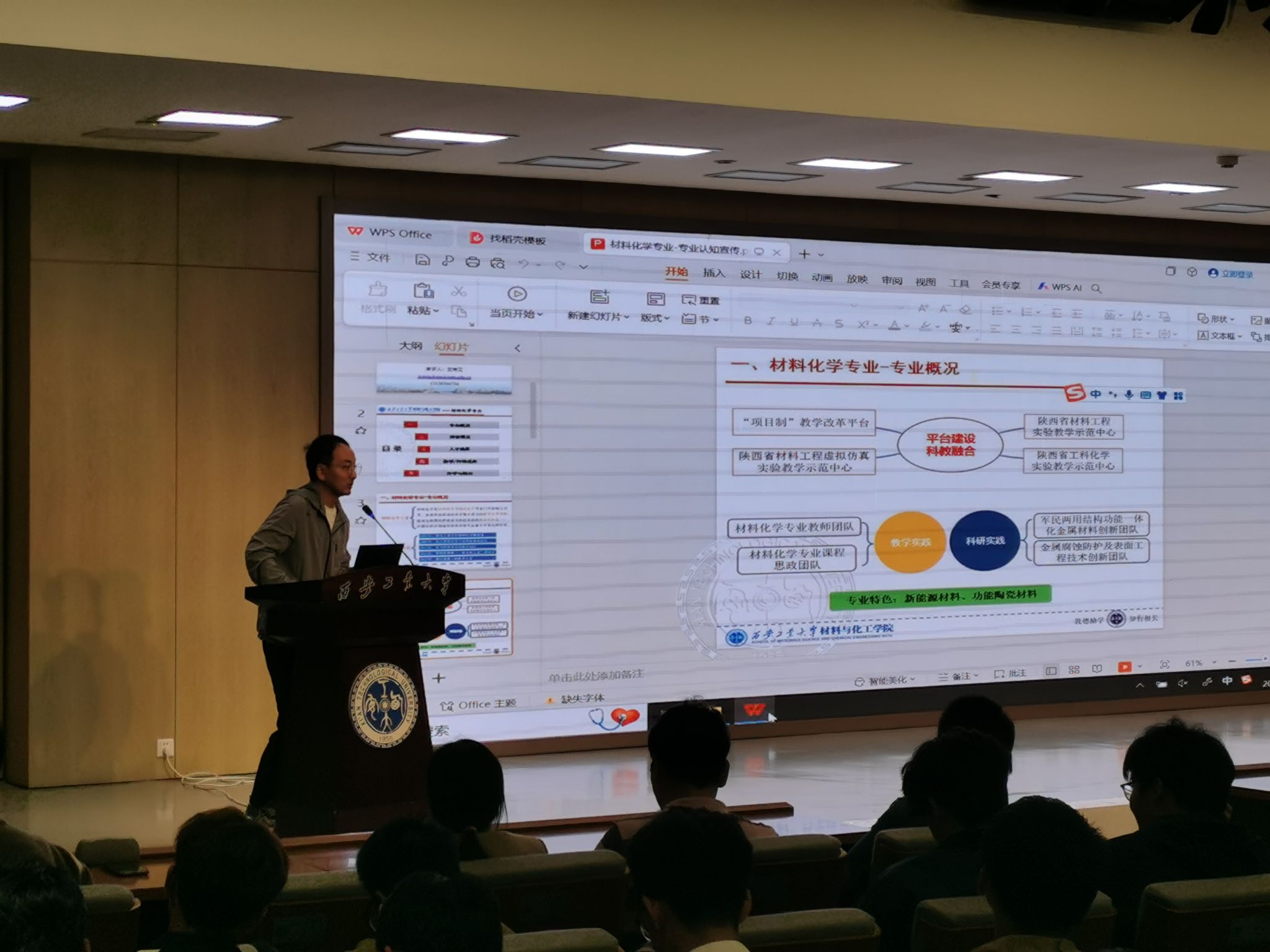 会上,杨巍首先致开幕词,他强调了专业认知的重要性,并鼓励同学们珍惜学习机会。随后,金属材料工程教研室主任刘永勤、高分子材料与工程教研室主任罗春燕、材料化学教研室副主任文瑞龙、无机非金属材料与工程教研室主任郭菲菲以及新能源科学与工程教研室主任李祥等五位资深教师进行宣讲,他们凭借丰富的行业经验和深厚的学术造诣,为同学们带来了一场场精彩纷呈的专业介绍。