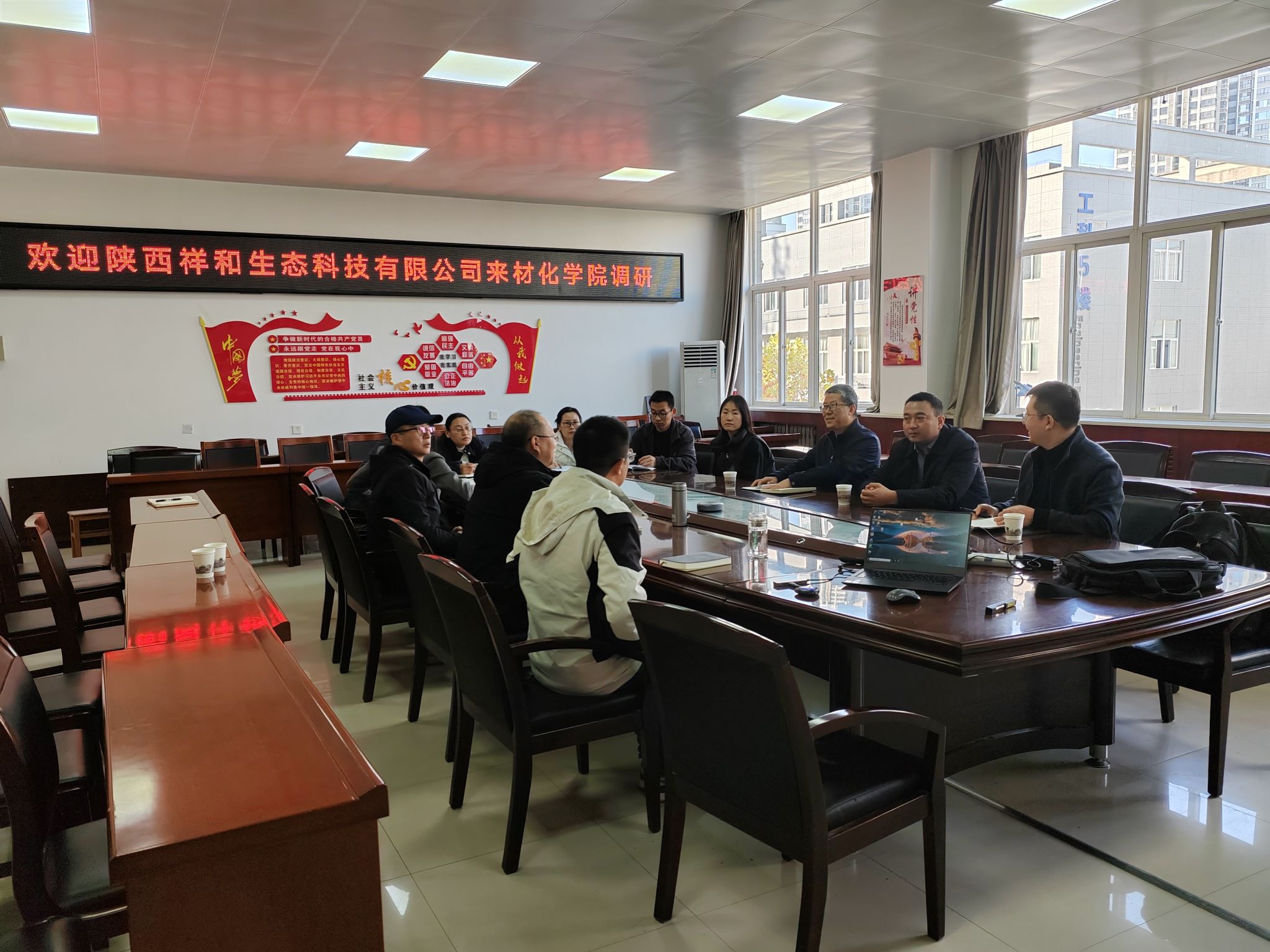 调研交流。本次调研交流会在工3-410召开,延长石油西北化工研究院张伟副院长、袁亚飞工程师及陕西祥和生态科技有限公司杨兴鹏董事长与小黄书