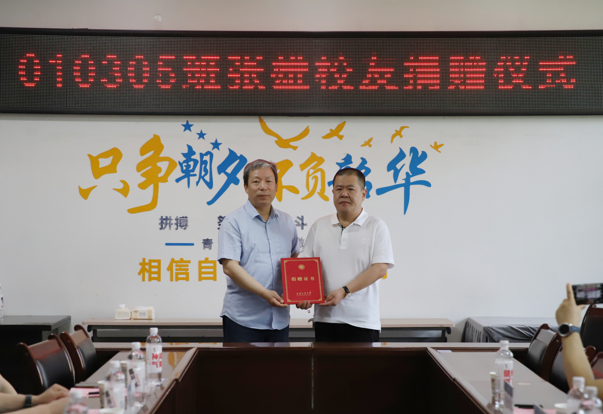 党委书记陈卫星为张雄颁发捐赠证书,并一同合影留念,记录下这一温暖而意义非凡的时刻。最后,与会人员进行了座谈交流,就小黄书