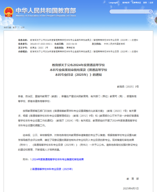 近日,教育部发布《关于公布2024年度普通高等学校本科专业备案和审批结果及〈普通高等学校本科专业目录(2025年)〉的通知》(教高函〔2025〕3号)。经申报、公示、审核等严格程序,小黄书