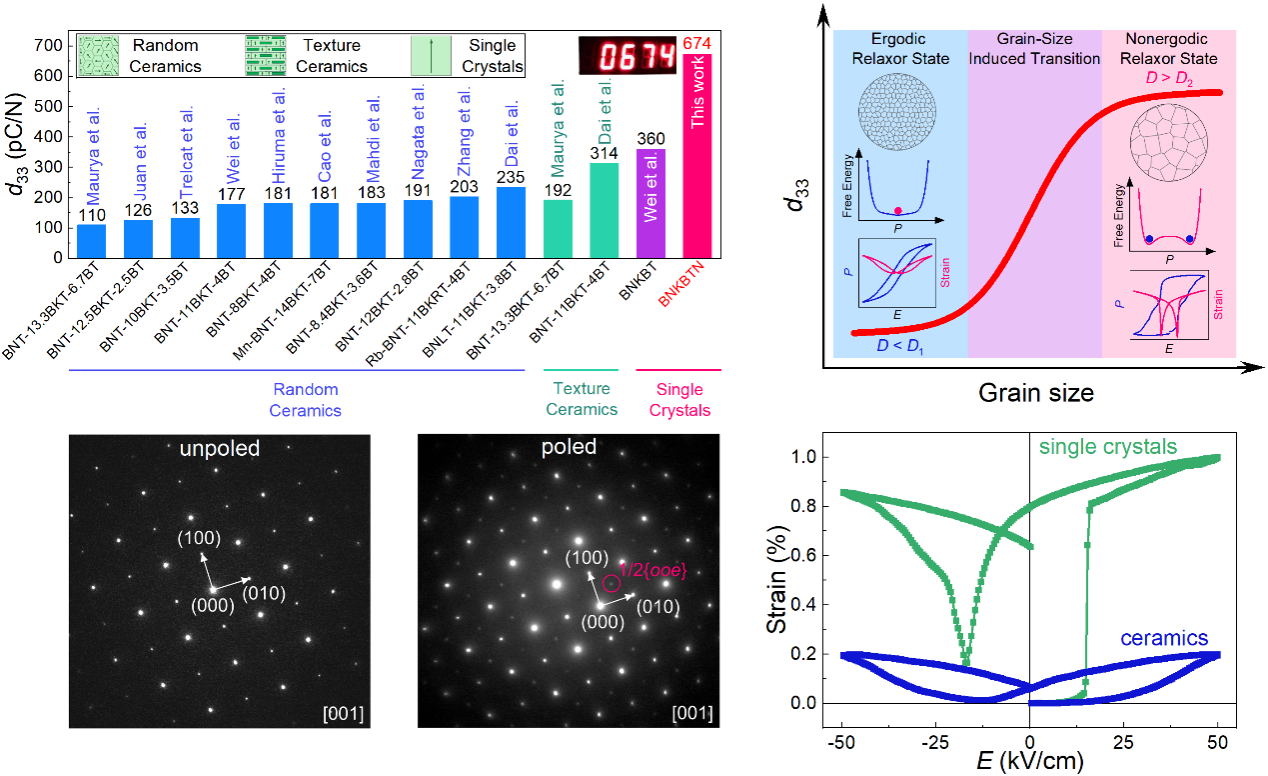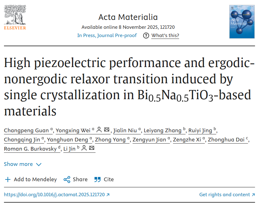 近日,我校魏永星副教授研究团队硕士研究生关畅澎在国际顶级学术期刊《Acta Materialia》(IF=9.3)上发表了题为“High piezoelectric performance and ergodic-nonergodic relaxor transition induced by single crystallization in Bi0.5Na0.5TiO3-based materials”的学术论文。小黄书