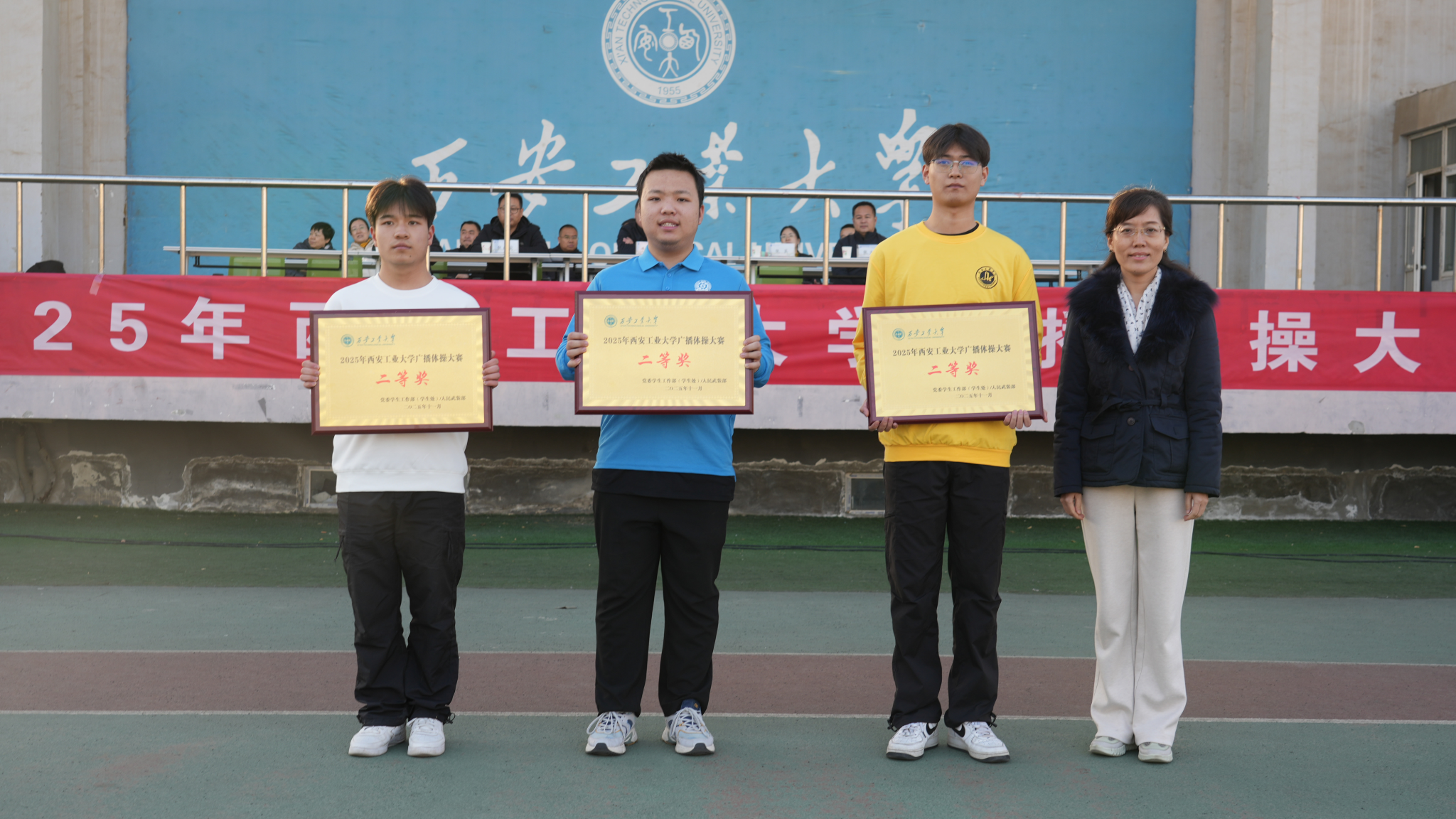 代表队身着统一服装,精神抖擞、步伐铿锵地步入赛场。随着广播体操音乐的响起,他们动作规范、整齐划一,伸臂、扩胸、转体、踢腿,每一个节拍都精准到位,最终以井然有序的队列及整齐规范的动作取得91.4的成绩,荣获大赛二等奖与优秀组织奖。