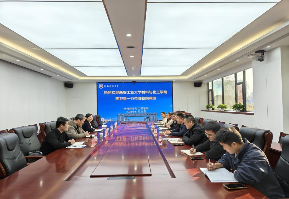 党委书记陈卫星、党委副书记梁艳峰、学院学工办主任段强和学院团委副书记乔娜一行四人于11月25日赴河南科技大学材料科学与工程学院开展专题调研;调研期间,受到河南科技大学材料科学与工程学院党委书记程光耀、院长张毅、党委副书记姚占杨的热情接待。