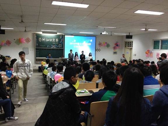科协于教2-306举办了一年一度的百科知识竞赛,2014级各班代表参加了此次比赛,小黄书