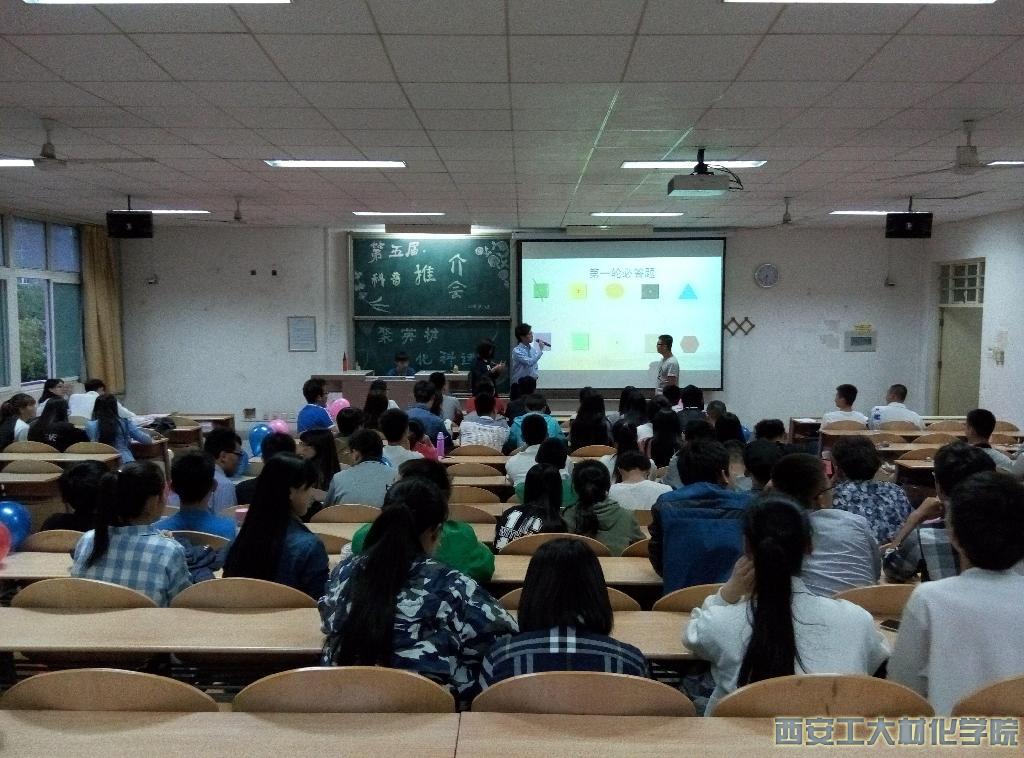 本次活动以“聚英材,化科谜”为主题,共包括“第五届大学生科普推介会开幕式;‘科学,就那么简单’;‘追根溯源’;第五届科普推介会闭幕式”四个子活动。其中“科学,就那么简单”由“其实你不胖”“米粒四射”“巧移乒乓球”三个趣味游戏组成,让同学们参与其中,引起同学们的兴趣,从而达到掀起一股学习科普知识的热潮的目的。在“追根溯源”室内活动中,包括知识问答环节和新奇的中场游戏环节,积极调动大家参与的积极性,引发大家的科学兴趣。