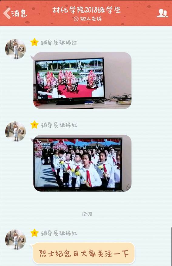 今天是2018年9月30日,是我国第五个烈士纪念日。关于烈士纪念日最新资讯小黄书 辅导员张瑞红老师利用网络社交平台及时与2018级全体学生分享了中央新闻视频。