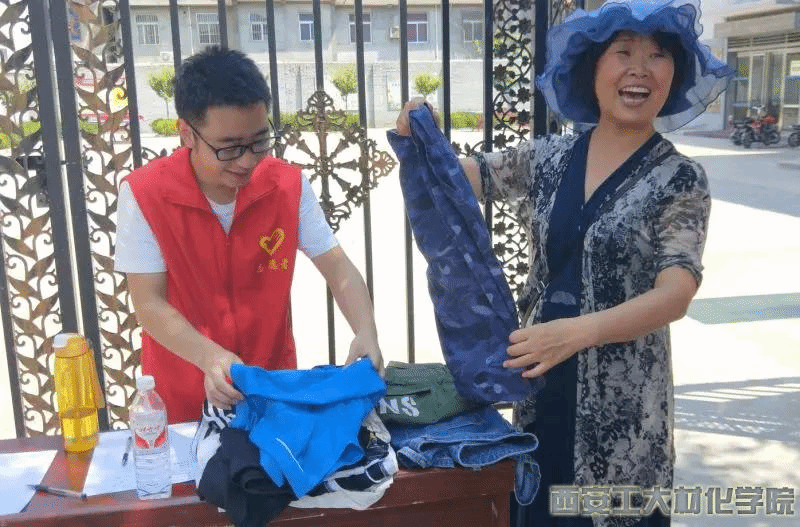 在与当地街道办丰原社区的工作人员沟通后,实践队员们开展了募捐活动。实践队员们做好了提前准备,给每位前来募捐的好心人递上一瓶冰镇的农夫山泉。头顶的烈日就好比像实践队员们心中的热情一样,更是多了一份干劲。在炎热的夏天中没有多少行人,实践队员们仍认真的介绍活动目的,但民众们参与度不高,当实践队员们快要陷入绝望之中,一位50多岁的阿姨加入了活动,她家离此处不远,不到10分钟就给队员们拿来了衣物,这让队员们非常感动。阿姨是一位教师,她非常支持大家的工作,主动帮助大家扩发这个讯息,她给队员声情并茂的讲了一些励志故事,此时过往的路人停下脚步,靠拢过来,不一会儿他们都从家中找出的不用的衣物,前来募捐。