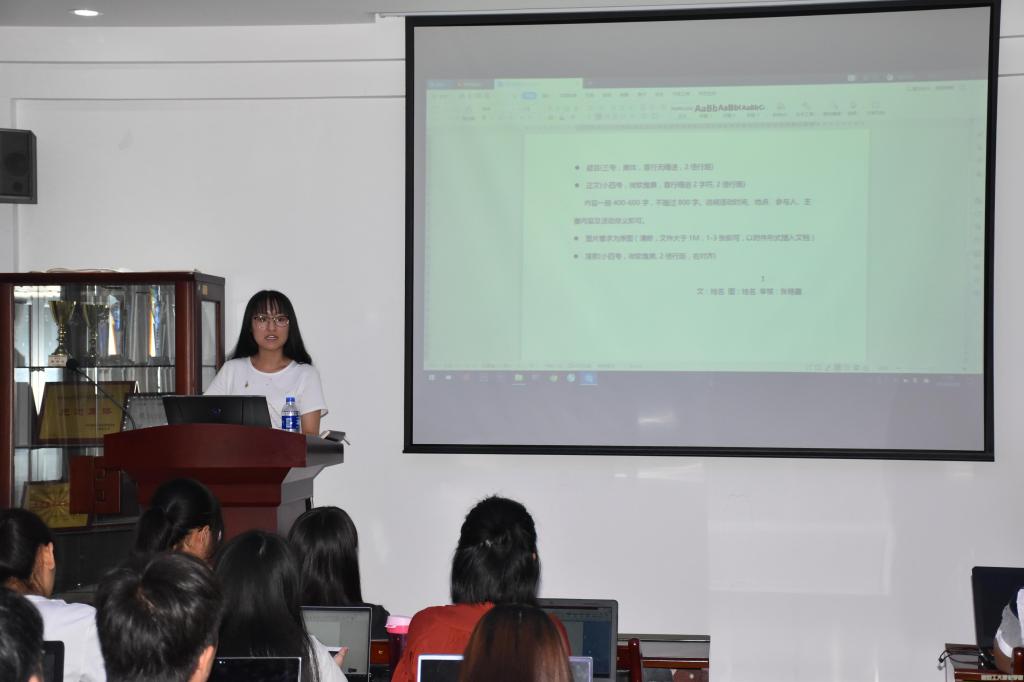 本次培训会由学生会副主席张思雨主持召开,她指出本次培训会旨在提高团学干部对通讯稿的重视度,加强干部使用办公软件的熟练度,为今后的工作打下扎实基础。其次,学生会副主席车枭向团学干部展示World文档处理的各项功能,并对World一些常用功能的操作进行详细的讲解,还一一解答了干部们提出的相关问题,让每一位团学干部都熟悉掌握Word办公时的具体功能和操作。最后,学生会副主席张思雨对通讯稿的写作格式做出具体要求,包括字体、字号、排版等,并结合不同类型的通讯稿范文分层次地、细致入微地介绍了通讯稿的写作要求、注意事项及常见错误。并强调学生工作虽然繁重,但学生干部们应始终将“全心全意为学生服务”的宗旨牢记于心,尽职尽责,为小黄书