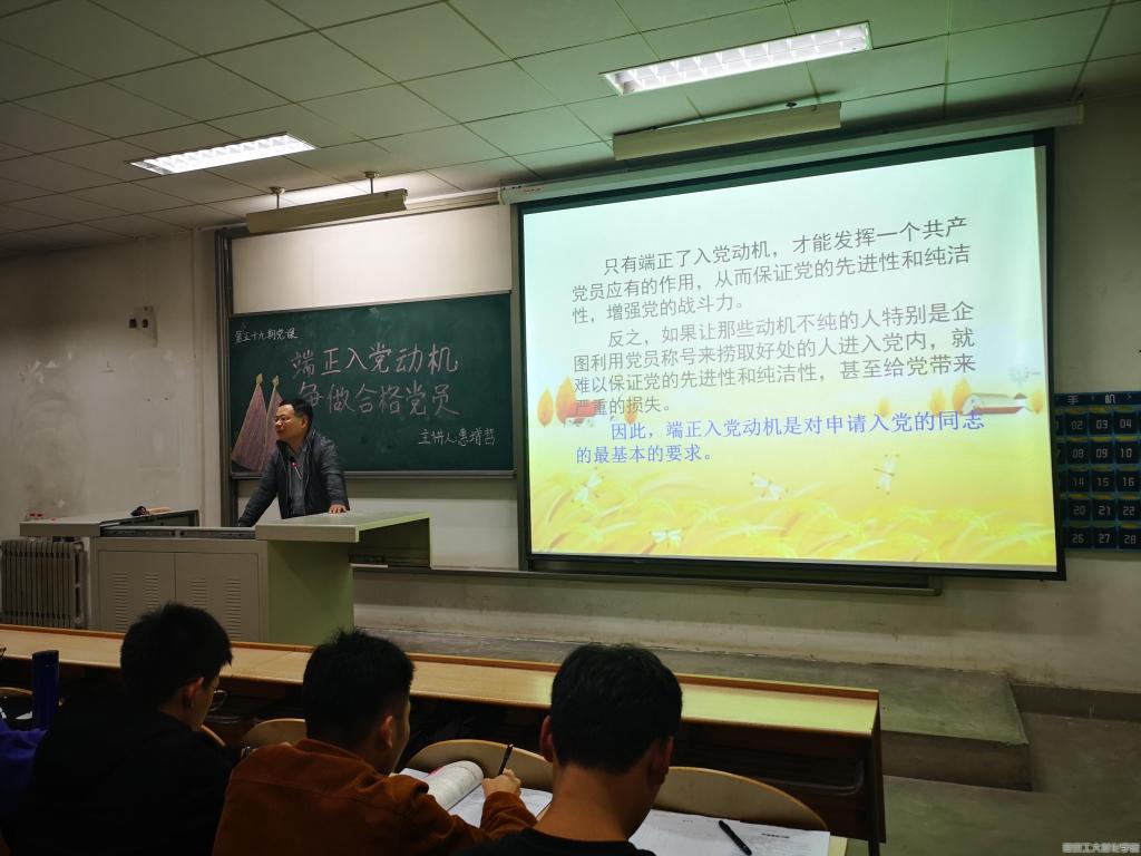 党课中,惠老师首先为大家明确了本次授课的目的:使学员知悉何为正确的入党动机以及作为共产党员所必须具备的思想觉悟。惠老师指出,入党动机是一个人要求入党的的内在原因和真实目的,端正入党动机是对入党积极分子的基本要求;他强调,作为党员应提升基本素养,全心全意为人民服务,正确的入党动机应是为了献身共产主义事业,更好的为人民服务而要求入党。其表现是对社会主义祖国和人民充满热爱,坚定马克思主义信仰,坚持中国特色社会主义道路,全心全意为人民服务,在实现中华民族的伟大复兴过程中实现人生价值;最后,惠老师向大家指出,当代大学生应该更好的掌握文化知识和专业理论知识,只有如此才能为党、为祖国、为人民做出更多贡献。