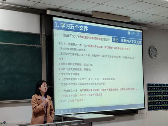 会上,陈远林做了考风考纪动员讲话,他从期末考试重点注意事项谈起,强调了诚信考试的重要性和考试作弊的危害,要求同学们要端正学习态度,诚信考试,积极应对,认真复习专业知识,以严肃认真的态度正确面对期末考试,加强自我管理、自我约束,考出真实好成绩。乔娜向2019级学生宣读了《小黄书