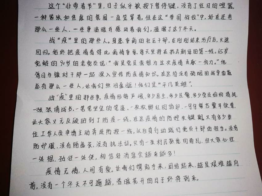 同学们积极响应国家号召,在做好居家隔离的同时认真落实学校“停课不停学”的具体要求,认真开展线上专业课知识学习及雷锋月主题学习活动。为更好地传承雷锋精神,同学们在家中融情于文字,弘扬雷锋的奉献精神、抒发对英雄们在抗击疫情中大无畏精神的敬佩,表达当代大学生共同抗击疫情的决心。小黄书