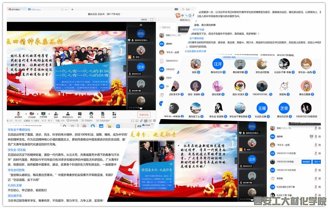 本次会议由学生干部潘薛帆主持。会议伊始,潘薛帆带领一同重温学习习近平总书记在纪念五四运动100周年大会上发表的重要讲话,并指出在抗击新冠肺炎疫情的过程中,青年一代挺身而出,成为抗疫大军的中坚力量,他们用行动证明,新时代的中国青年是好样的,是堪当大任的!随后,大家通过学习展开热议,多数学生叙述自己对于五四精神的认识及感悟,新时代中国青年要增强学习紧迫感,掌握科学文化知识和专业技能,提高人文素养,锤炼品格、增长才干、练就本领,以真才实学服务人民,以创新创造贡献国家!最后,学生干部张阳强调了大家居家学习要充分利用好线上资源,学习时刻不能松懈,并叮嘱大家在疫情结束的收官战之时,更要做好防疫工作,为疫情防控作出自己应做到的贡献,勇立时代潮头,争做时代先锋。至此,本次会议圆满结束。