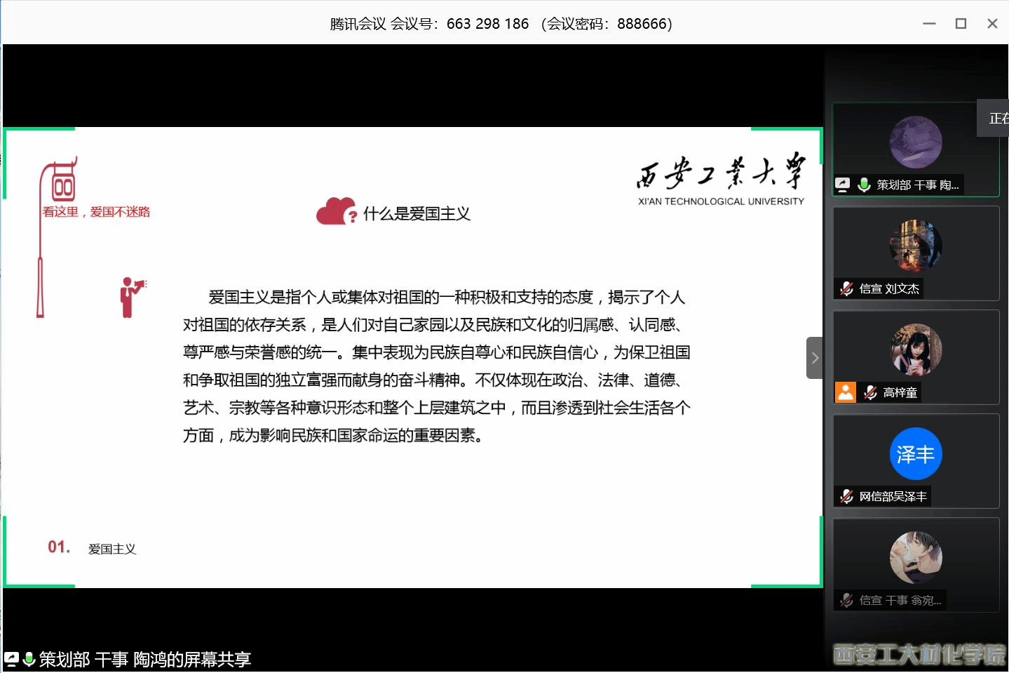 本次视频学习会由策划部干事陶鸿主持。会议开始,主持人首先向大家介绍爱国主义的含义及意义,她通过一段视频向大家展示出各行各业民众的爱国精神与情怀,引发出大家对爱国主义精神的思考。视频结束后,全体干事纷纷表达出自己的看法,到场干事畅所欲言,将学习会氛围推到高潮。随后,主持人播放习近平总书记关于爱国精神的讲话相关视频,让大家了解到当代大学生继承和发扬五四精神的重要性。临近尾声,科协全体到场成员分享自己通过本次学习会得到的体会,作为当代大学生,必须牢记爱国精神,向伟大的榜样力量学习。至此,本次会议圆满结束。