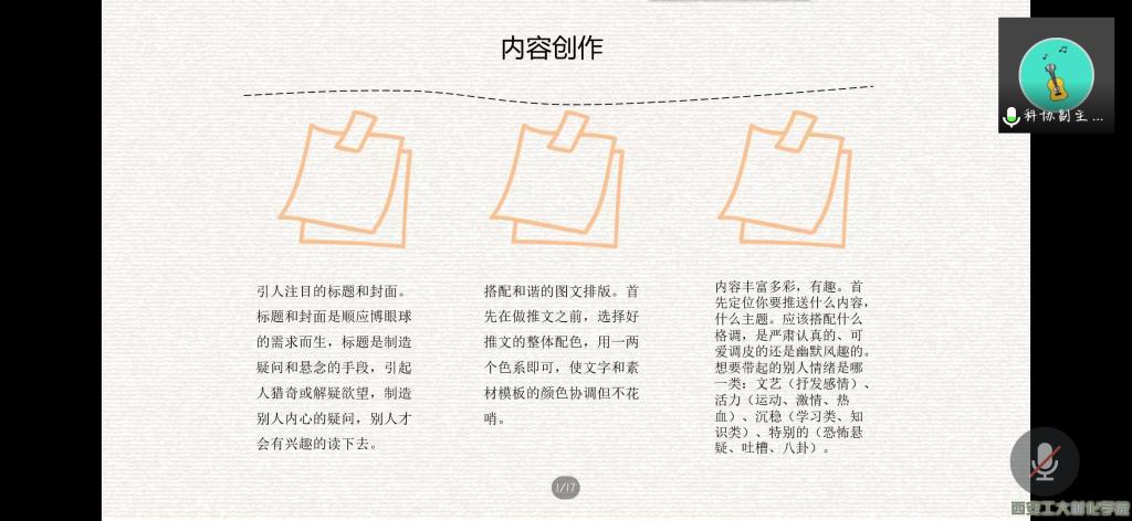 微信公众号平台的建立、登录和平台内容创作三大部分进行概述,并着重强调了订阅号和服务号的区别,详细讲述公众号的管理流程及推文的创作。详细的讲解让团学干部更好更快地了解和运用微信公众号。