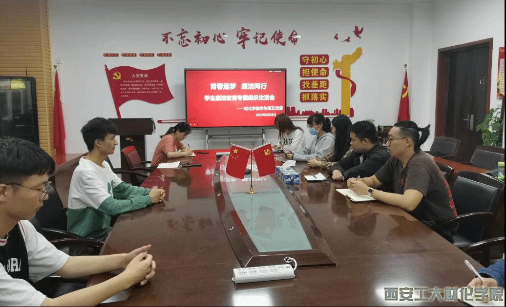 学生第五党支部于9月28日晚在工3-410组织开展“青春逐梦 廉洁同行”学生廉洁教育专题组织生活会。学生第五党支部书记乔娜以及全体党支部成员出席会议,会议由支部组织委员吕雪敏同志主持。