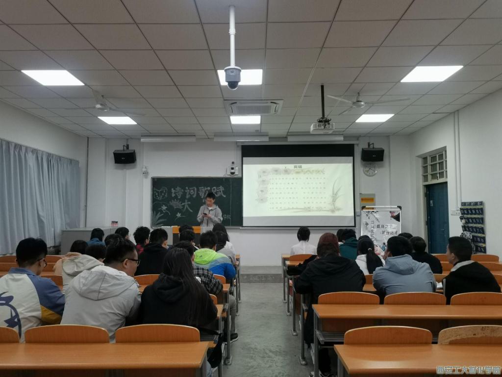 本次活动由线上答题与现场朗诵两部分组成,于2021年4月1日22点-22点30举办了线上初赛,由学生干部统计答题成绩并公布复赛名单后,2021年4月7日19点在教三-201举办线下晋级赛。学生干部延涵冰,欧阳雪芝,余光浩,张盛辰,房双双等作为评为出席了此次活动。本次活动由学生干部郑磊主持,宣布活动开始后,参赛选手依次朗诵诗词歌赋,并结合PPT讲解诗词中所表达的含义。选手们丰富的知识储备与隐健的台风赢得了台下观众的掌声。通过评委打分,评比出一等奖、二等奖、三等奖,三组选手。在获奖选手与评委合影留念后活动圆满结束。