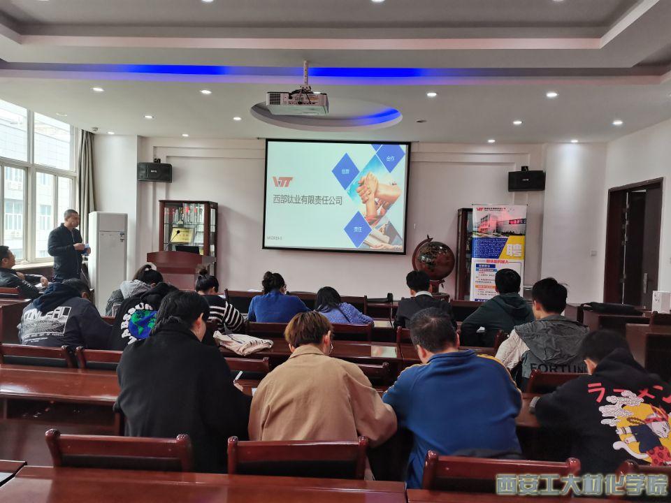 西部钛业有限公司相关工作人员为小黄书金属材料工程专业同学介绍公司情况,主要鹆钛、锆及其合金加工材生产的大开型国有高新技术企业,是西北有色金属研究院的产业实体,是上市公司西部材料的控股子公司。相关工作人员为同学们详细讲解了钛合金的制造生产以及相关先进的核心生产机器,同时为同学们介绍了西部钛业的薪资、福利和待遇以及未来的晋升路线。