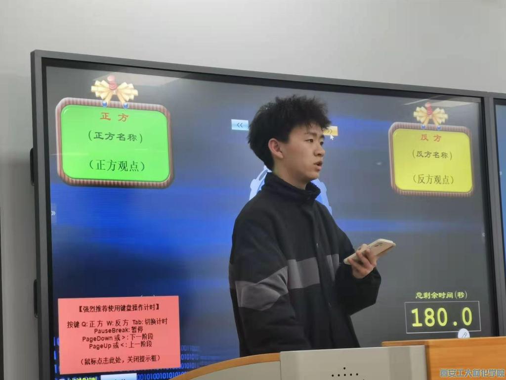 本次“辩一题而有知,论纵横而明志”辩论赛培训会,由演讲与辩论协会学生干部贾国锋主持。活动伊始由主持人向大家介绍辩论赛举行规则,介绍过程生动有趣,言简意赅,富有感染力,语言凝练,使大家充分明白辩论赛规则;接着,演讲与辩论协会学生干部师晓婷及陈佳佳主持抽取辩题环节,由各队队长依次有序排列抽取,进行正反方配对;演讲与辩论协会协会学生干部余光浩针对本次辩论赛的主题和内容设置等方面与参赛选手进行交流,对于疑问一一进行解答。至此,本次辩论赛培训圆满结束。