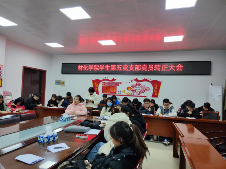 学生第五党支部于工三-410召开预备党员转正会议。党支部书记乔娜、支部正式党员、预备党员等35名同志出席会议,本次会议由支部副书记吕雪敏同志主持。