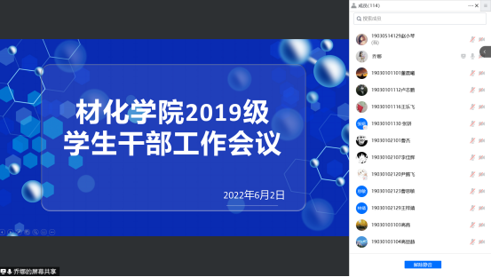 2019级于2022年6月2日中午通过腾讯会议召开了2019级学生干部工作会议。2019级学生辅导员乔娜主持会议,2019级全体学生干部参会。