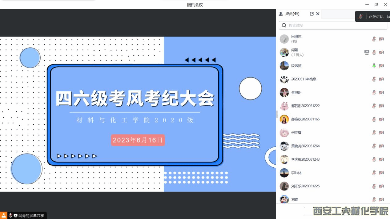 2020级在腾讯会议召开了四六级考风考纪大会。2020级全体班委参加了本次会议。本次会议由2020级辅导员段强主持。