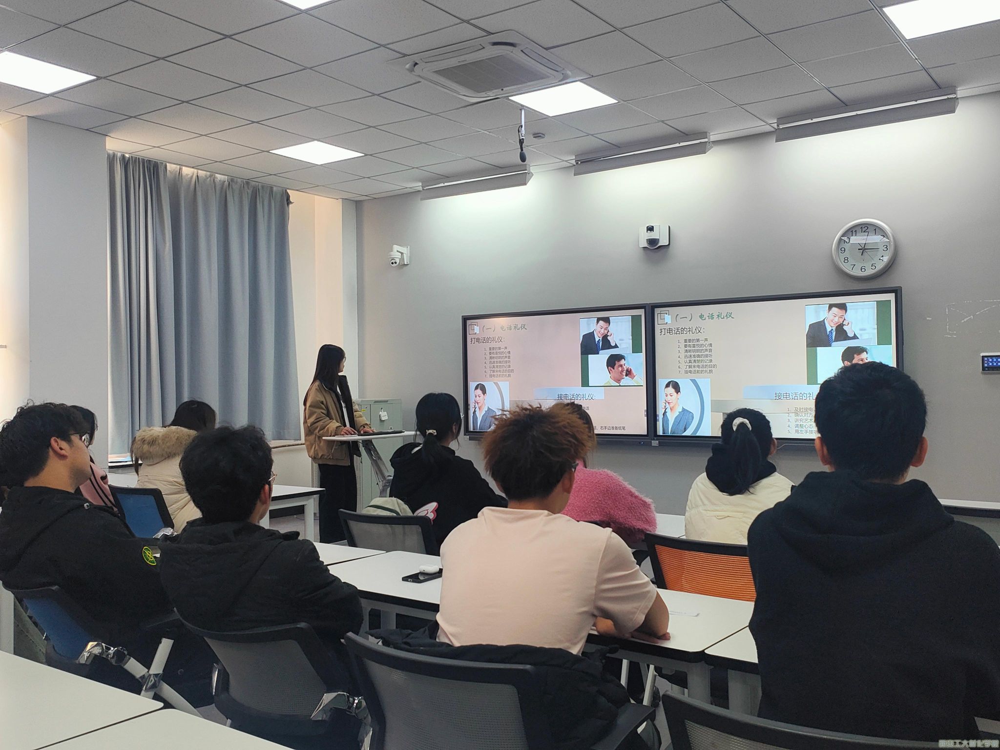 活动中,学生干部许淑敏以商务礼仪文化的重要性为切入点,结合生活与职场向大家讲述商务礼仪的细节讲究,同时通过文字与图片相结合,以名片礼仪、会面礼仪、电话礼仪等五种基本礼仪为例,详细地向大家介绍了这五种商务礼仪的实际应用场景以及实际应用时的注意事项。另外,本次活动以模拟情景演绎的方式让同学们在规定时间内通过小组讨论用学到的商务礼仪知识配合工作人员现场完成模拟情景演绎。在场的同学们通过激烈的讨论,踊跃的参与到模拟情景演绎中,身临其境的了解到如何正确应用商务礼仪于实际生活中,同时更加深刻的认识到商务礼仪文化的精髓,能够通过在实际生活中通过商务礼仪更好的展现自我能力和自身价值。