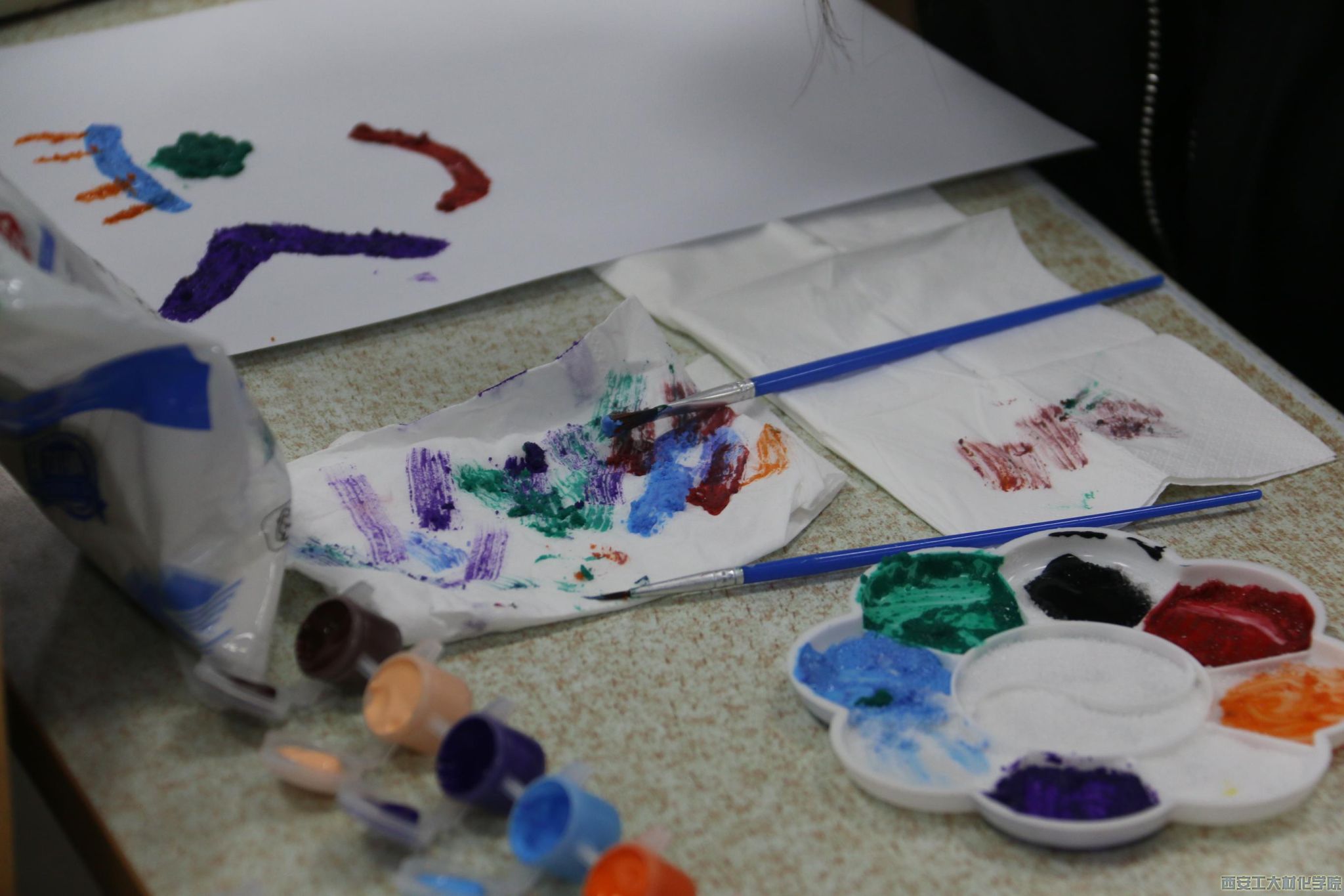 会议伊始,由主持人为参赛学生介绍活动内容、环节及举办的重要意义。本次活动围绕着情绪二字开展,共分三个环节,分别为“猜情绪”、“‘盐’磨情绪”和“再‘盐‘情绪”,活动简单却不缺少乐趣。比赛中参赛学生可以根据屏幕上的情绪词语,利用自己的表情和动作对搭档进行表达,引导搭档猜词;比赛第二阶段中顺利晋级的前六组队伍通过8分钟时间的冥想,再选择盐、画纸和颜料等道具对生活中难以表达的情绪进行绘画表达,通过观看自己的作品进一步“聆听”情绪的声音,可以选择二次创作或保留作品,每位参赛学生有五分钟的时间针对作品向评委讲解创作意义。活动期间,所有参赛学生活力四射,热情开朗,在活动中获得精神上的释放与安定。