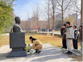 吴运铎烈士塑像巍然耸立,学生庄严肃立,向这位伟大的革命先烈致以崇高的敬意。辅导员张瑞红老师向烈士敬献鲜花,全体学生鞠躬,悼念兵器制造专家吴运铎,表达对英雄的敬仰和缅怀之情。随后,辅导员张瑞红老师带领学生进行重温入团誓词,让全体学生把一切献给党的精神薪火相传,认识到青年学生的责任和使命。