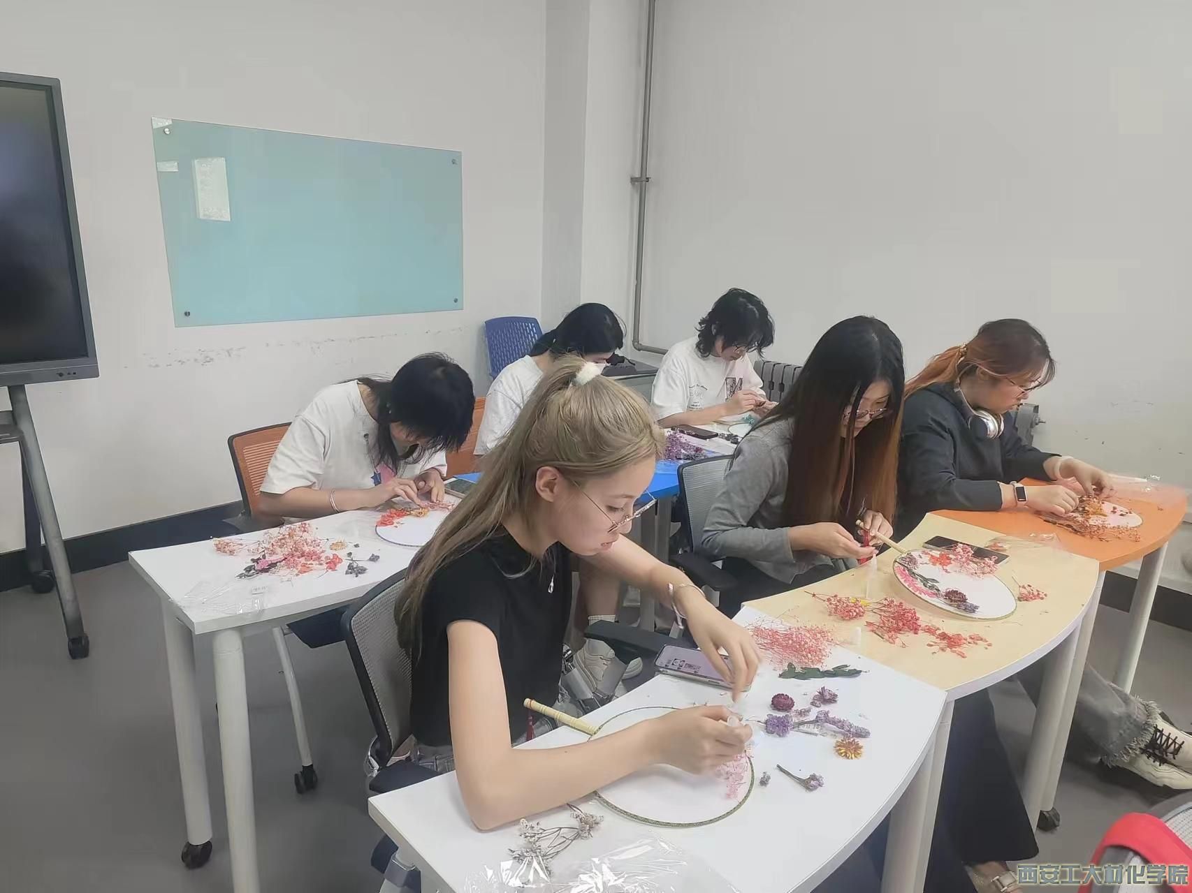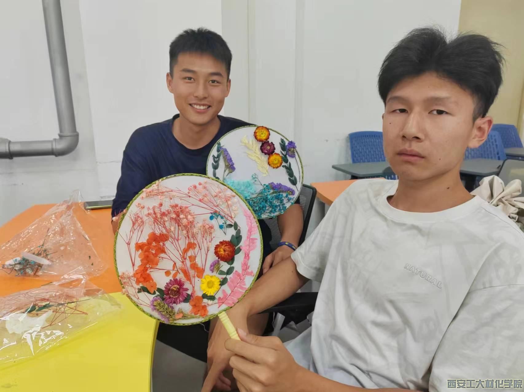 活动伊始,学生干部王国庆通过文字和图片相结合的形式介绍了团扇的文化背景和制作方法。随后大家挑选好自己喜欢的干花、空白扇子等制作材料,慢慢摸索、细细构图。活动现场弥漫着浓厚的创作热情,几片叶子、数朵干花,几经摆弄,细心粘贴,一幅幅充满创意的作品跃然扇上,素雅的团扇在大家手中重新焕发生机,被赋予了与众不同的意义。在展示环节,同学们与亲手制作的干花团扇争相合影,如花人生,美丽相伴。
