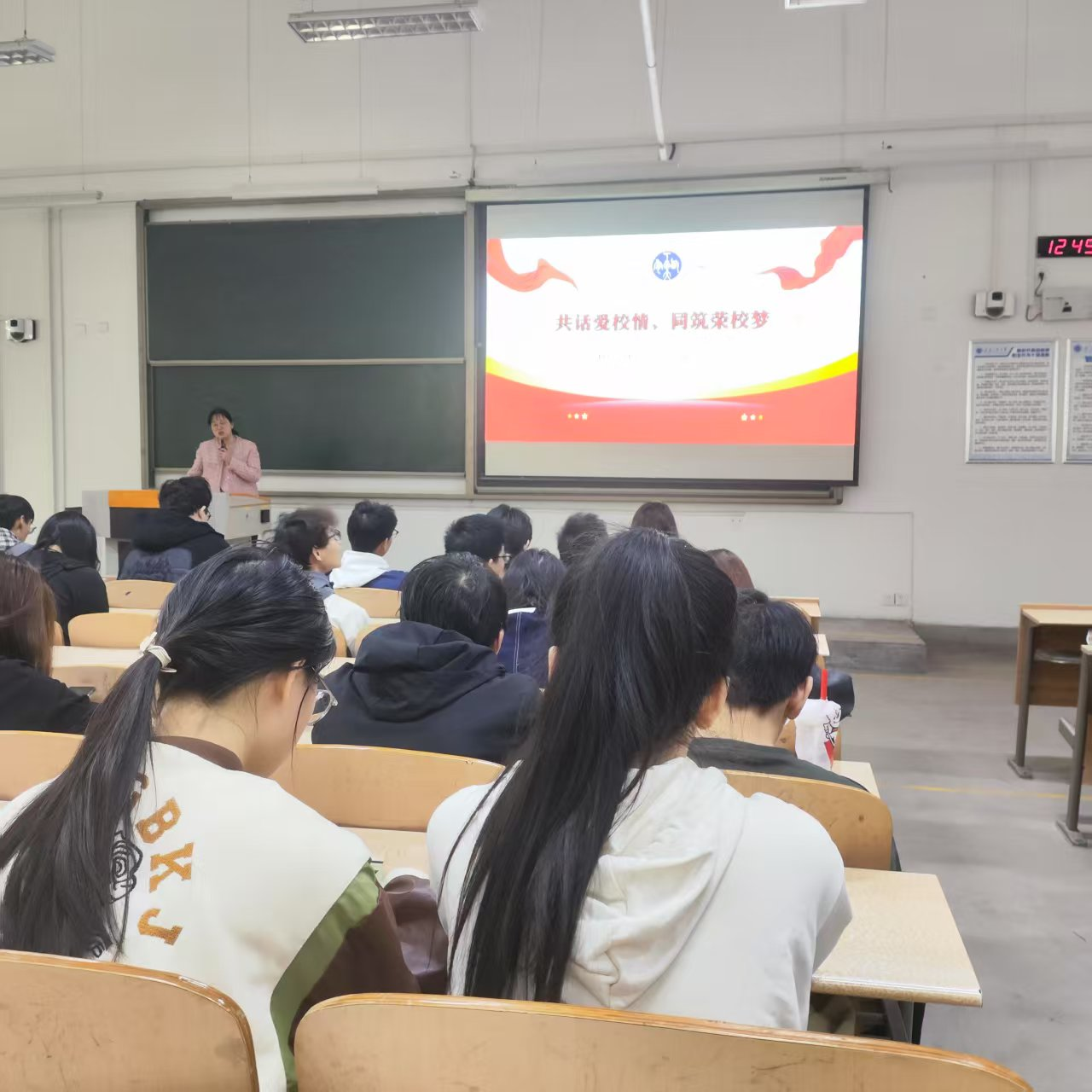 2023级于教1-205举行了“共话爱校情 同筑荣校梦”主题年级大会。辅导员乔娜以及全体2023级学生共同参与了此次大会。