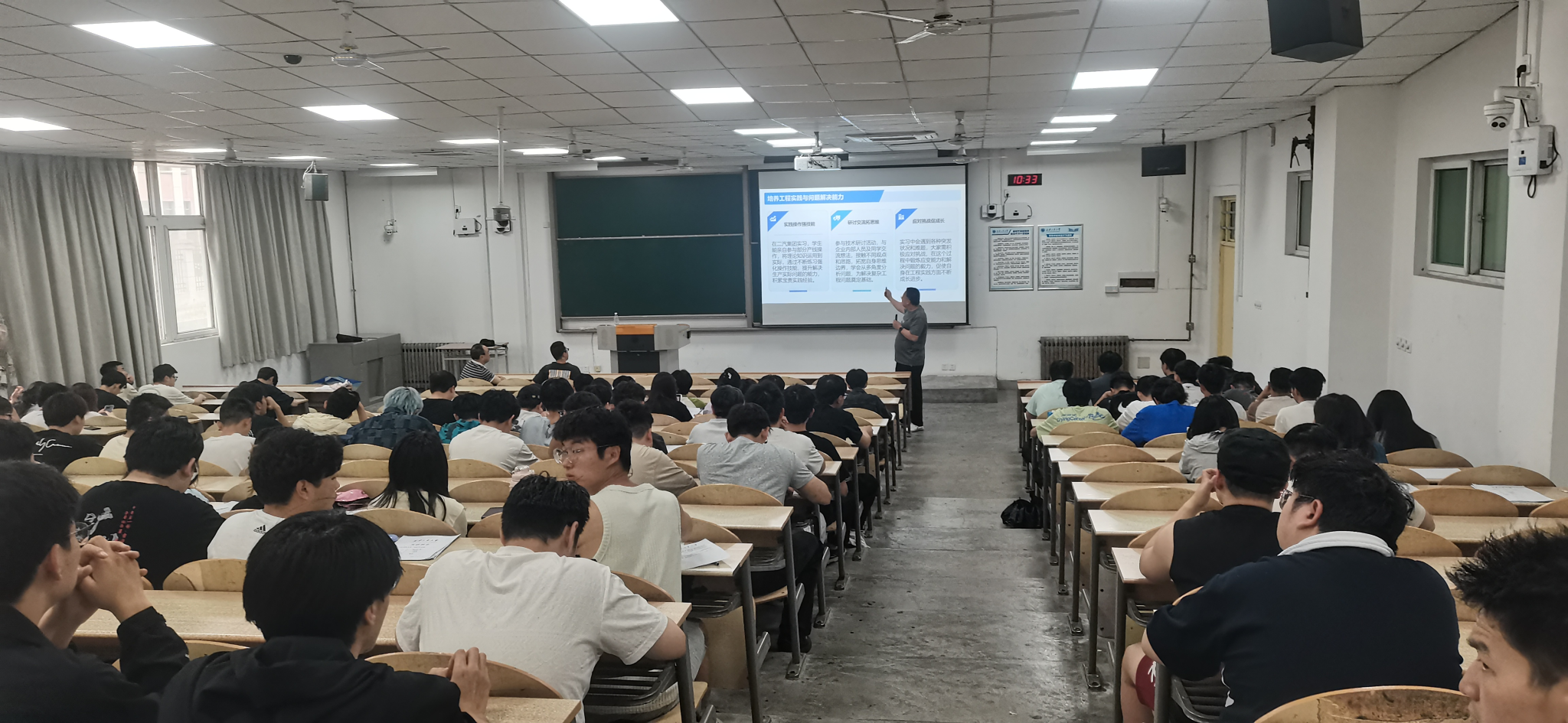 会上,夏峰老师首先介绍了本次实习的背景与目的。他指出,湖北十堰二汽作为我国著名的汽车制造重镇,拥有完整的金属材料加工流程与成熟的汽车零部件生产体系,能够为同学们提供沉浸式的学习场景。随后,刘志学老师着重强调了实习期间的纪律与安全规范。他要求全体学生严格遵守车间各项规章制度,服从企业和带队老师的管理。同时,他还强调同学们要养成每日撰写实习笔记的习惯,将实习过程中的所见、所学、所感详细记录下来,实习结束后按时提交高质量的实习报告。最后,夏峰老师详细说明了学生坐火车出发的时间和集合地点。他特别叮嘱同学们在火车上要注意个人财物安全,保管好身份证、车票等重要证件。同时,夏峰老师一一解答了学生的疑问,消除了同学们的困惑与担忧,让大家对即将到来的实习充满期待。