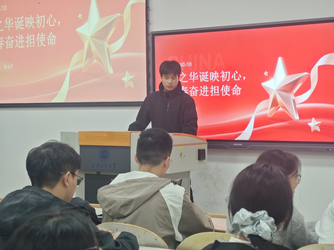团委于2025年10月10日在教2-103开展“国之华诞映初心,青春奋进担使命”理论学习会。会议由学生干部谢金洋主讲,小黄书
