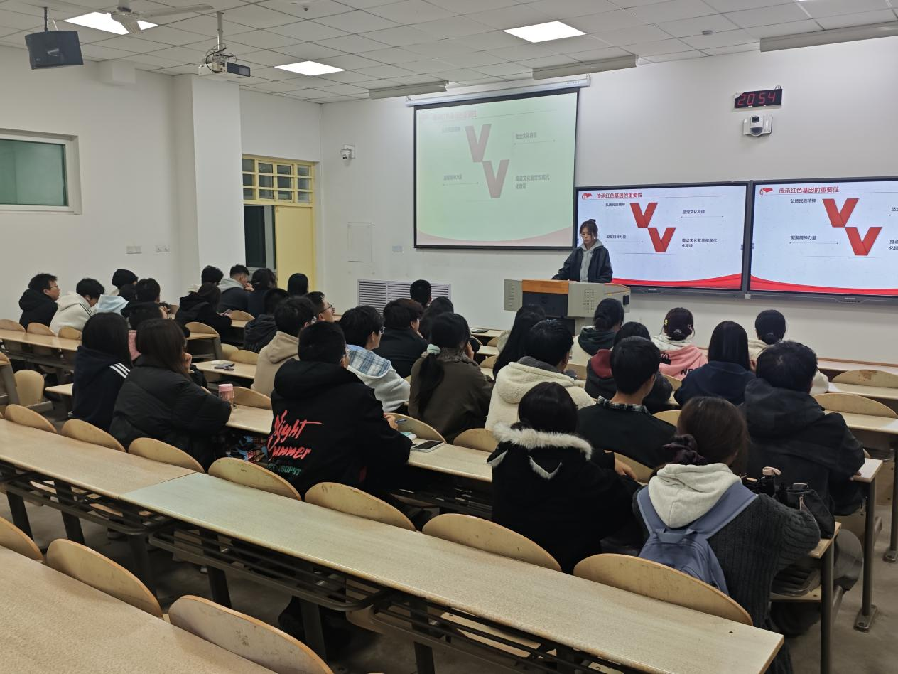 会上,张妍宁围绕红色基因的内涵、历史传承与青年责任展开讲解,通过井冈山精神、长征精神、延安精神等红色精神,生动阐释了红色基因作为中华民族精神根脉的重要意义。她强调,新时代青年要争做红色基因的“学习者、传播者、践行者”,通过专题学习、故事分享、志愿服务等形式,将红色精神融入日常学习与生活。在互动环节,大家结合自身经历围绕“青年如何传承红色基因”展开热烈讨论,一致认为应立足专业、服务社会,在实干中践行初心使命。
