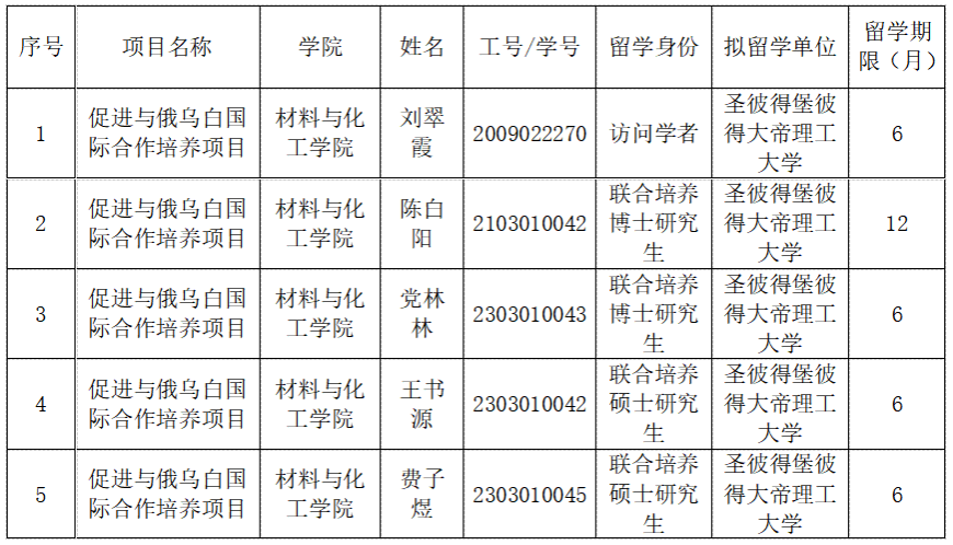 根据国家留学基金委2024年促进与俄乌白国际合作培养项目要求,小黄书于2024年9月启动第二批促进与俄乌白国际合作培养项目院内遴选工作。经个人申请、导师推荐、小黄书 和学校审核,确定5名候选人,现予以公示。公示时间:2024年9月2日至2024年9月6日。